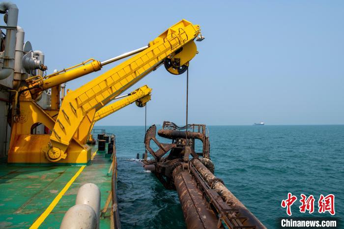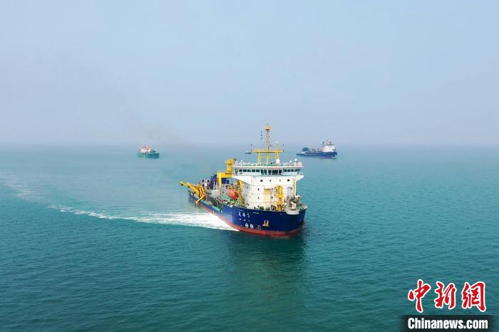 中新网北海4月2日电(翟李强 龙颖颖 王晓辉)4月2日,在广西北海涠洲岛北部的北海铁山港20万吨级航道建设现场,国内顶尖的耙吸式挖泥船“浚海5”等三艘大型耙吸式挖泥船同时作业,为这条“黄金水道”加速疏浚。