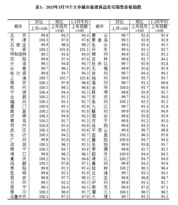 2025年3月70个大中城市新建商品住宅销售价格指数。截图自国家统计局官网