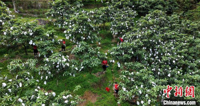 图为4月16日,果农在果园里采摘枇杷(无人机照片)。潘志祥 摄
