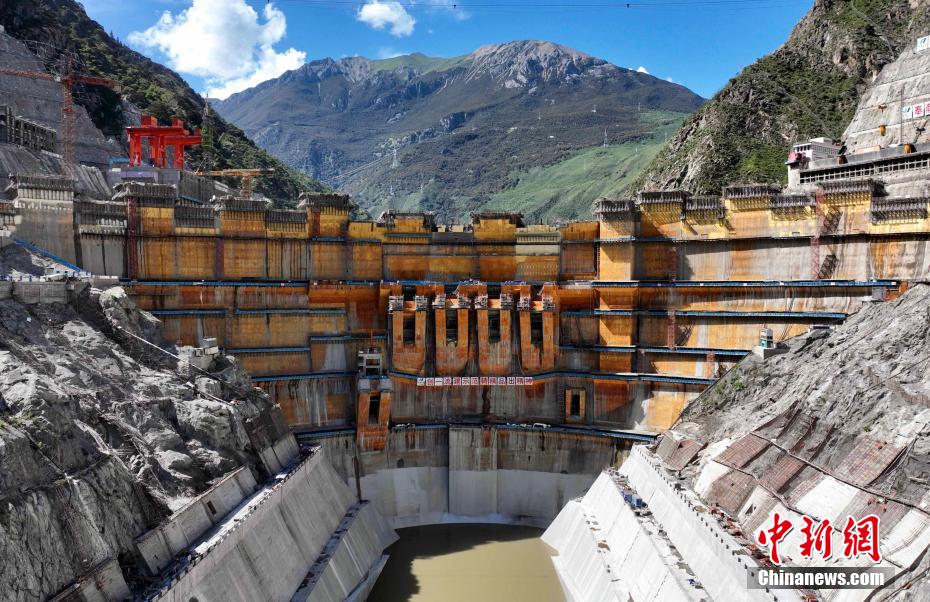 7月7日,航拍建设中的叶巴滩水电站。叶巴滩水电站地处四川省白玉县与西藏自治区贡觉县交界处的金沙江上游,总装机容量224万千瓦,最大坝高217米,正常蓄水位2889米,是中国在建海拔最高双曲拱坝电站。(无人机照片)中新社记者 王磊 摄