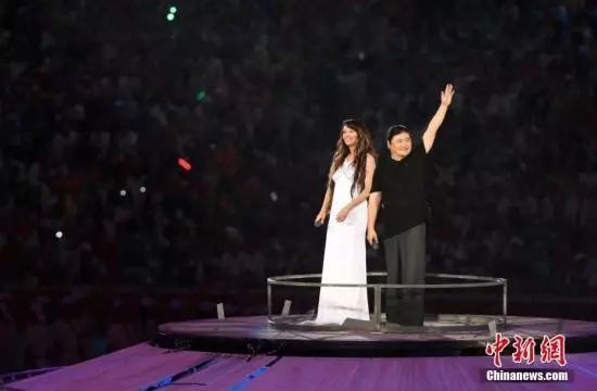 资料图:刘欢和莎拉-布莱曼在鸟巢中央共同演唱北京奥运会开幕式主题歌《you and me(我和你)》。中新社记者 任晨鸣 摄