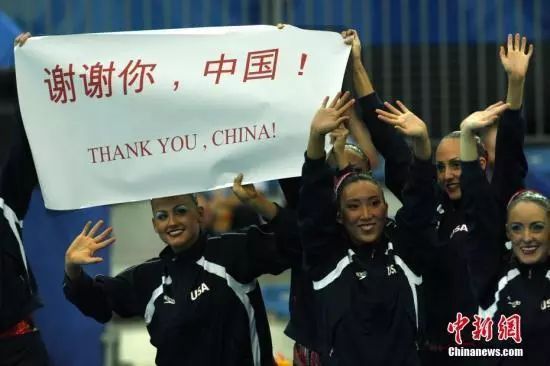 资料图:在2008年8月23日举行的花游集体项目自由自选决赛前,美国队队员入场时,打出“谢谢你,中国”的条幅,这一幕令人难忘。中新社记者 杜洋 摄
