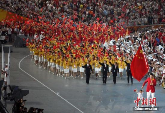 资料图:2008年8月8日,第29届夏季奥运会在北京国家体育场“鸟巢”举行。中国代表团的旗手是著名篮球运动员姚明,走在姚明身边的是获得英雄少年光荣称号的四川省阿坝州映秀镇渔子溪小学二年级学生林浩。中新社记者 任晨鸣 摄