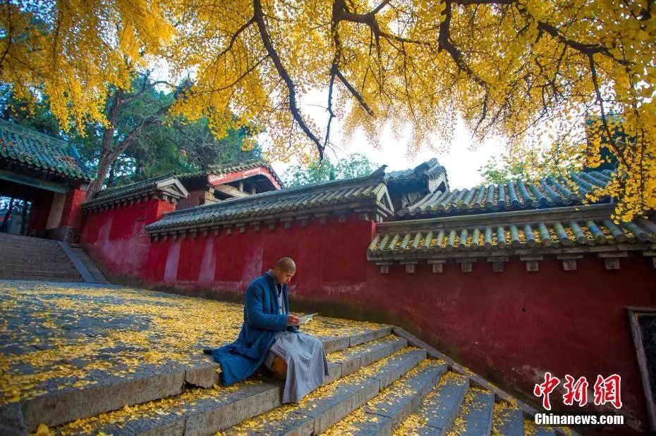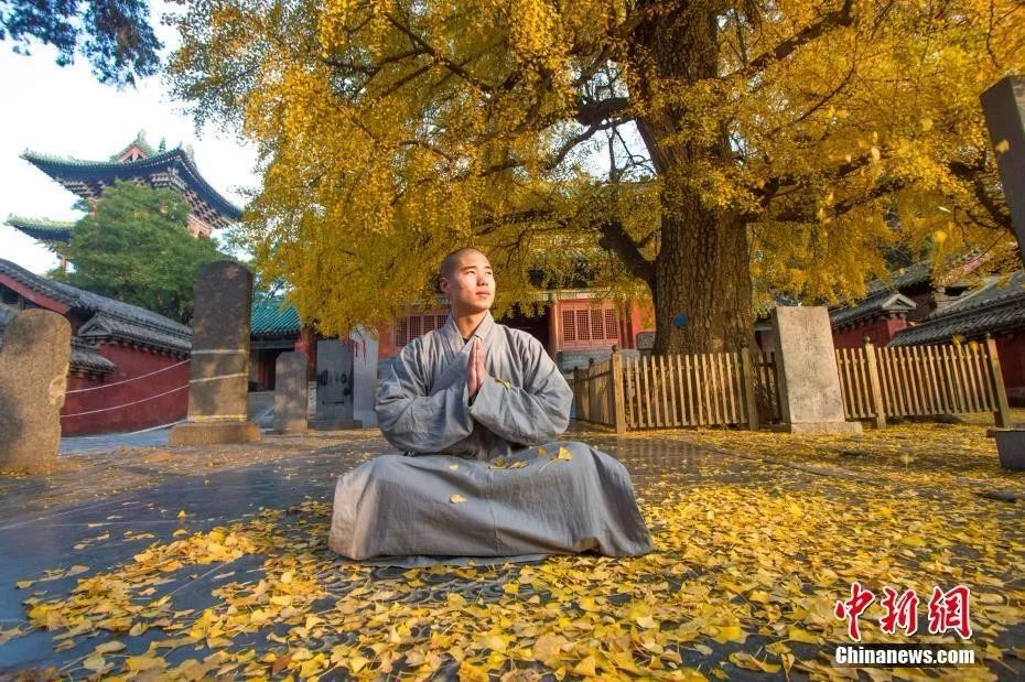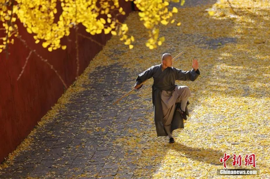 资料图:2019年,嵩山少林寺银杏树下习武的僧人。岳龙 摄