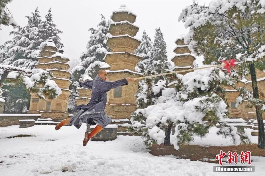 资料图:大雪过后,少林武僧在塔林习武。岳龙 摄