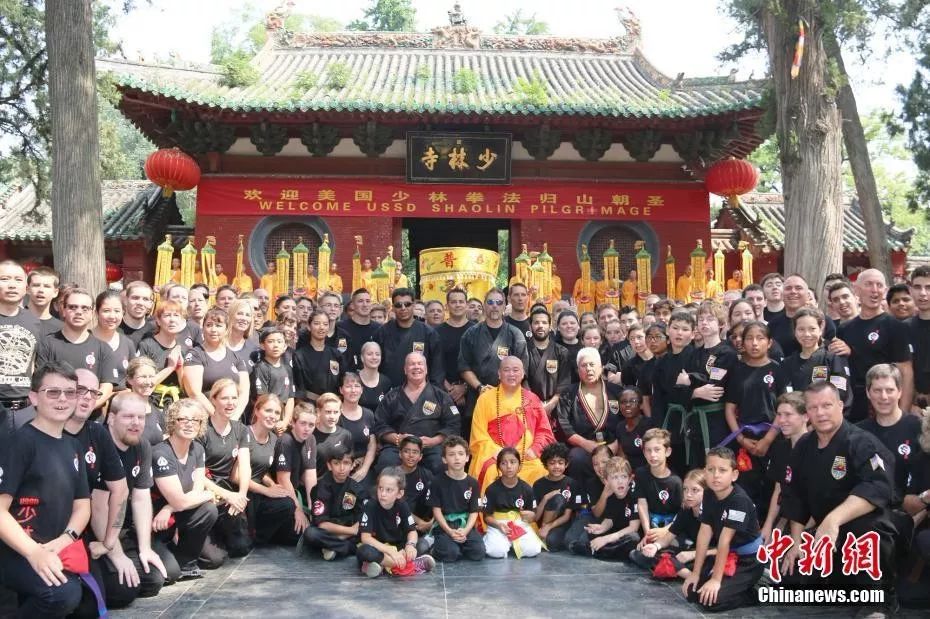 资料图:“洋弟子”与少林寺方丈释永信在山门前合影。岳龙 摄
