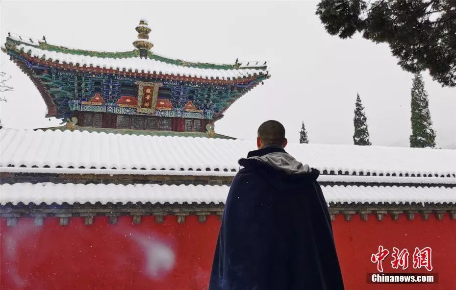 资料图:少林寺僧侣赏雪。岳龙 摄