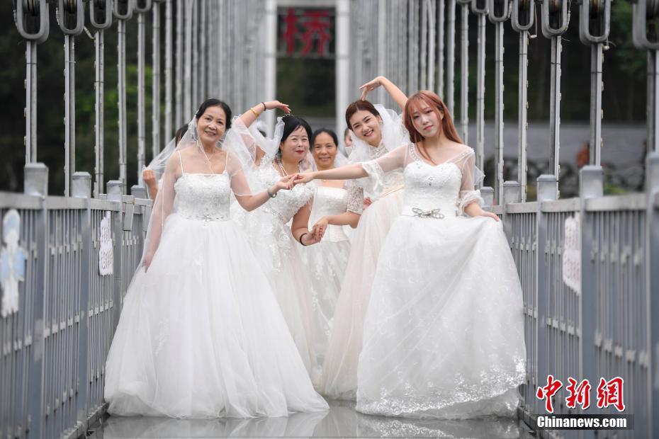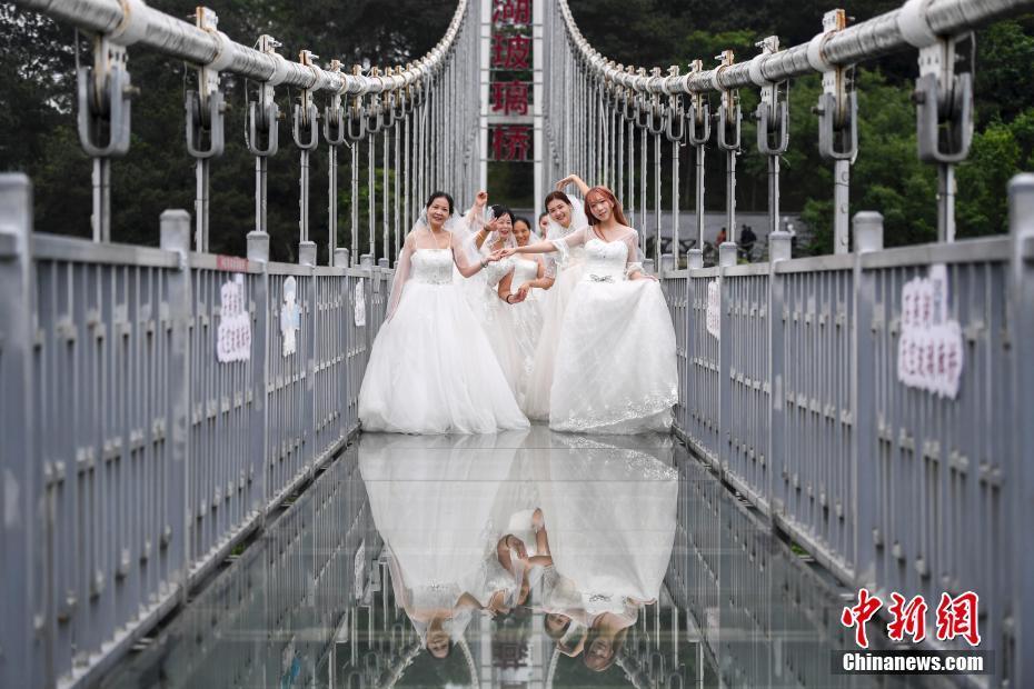 4月28日,正值五一劳动节前夕,湖南长沙石燕湖的众多女性基层劳动者身着婚纱登上了高空玻璃桥,为自己拍起了婚纱照,主办方用这种独特的方式为这些劳动者们庆祝属于自己的节日。 杨华峰 摄