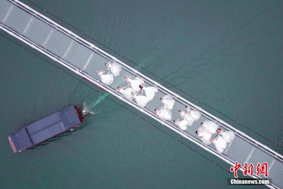 劳动者们躺在玻璃桥上拍摄集体婚纱照。 杨华峰 摄