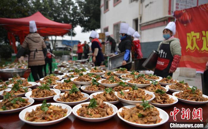 村民们边看舞龙表演,边品坝坝宴。 刘忠俊 摄