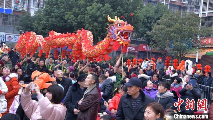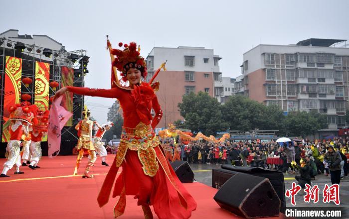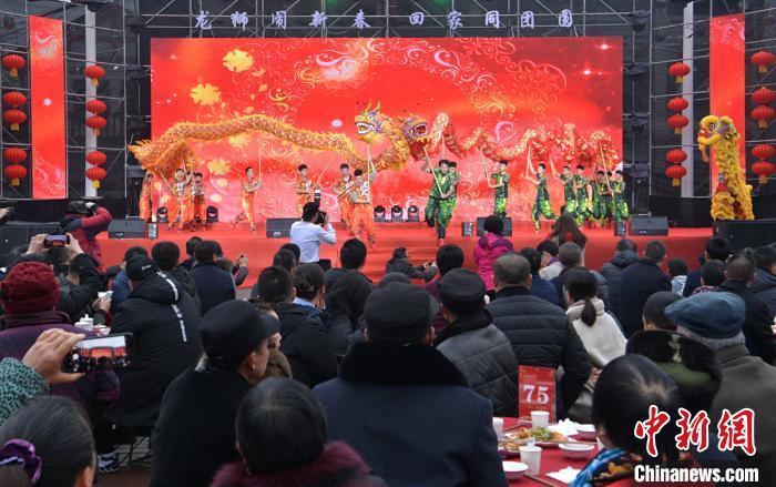 文艺工作者为村民们表演精彩的文艺节目。 刘忠俊 摄 1月18日,春节临近,四川眉山东坡区尚义镇举行“龙狮闹新春回家同团圆”乡村春晚以及万人坝坝宴拉开序幕,万余村民齐聚,热热闹闹迎接农历新春的到来。