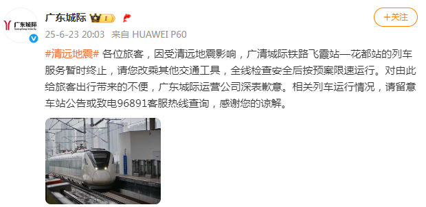 各位旅客,因受清远地震影响,广清城际铁路飞霞站—花都站的列车服务暂时终止,请您改乘其他交通工具,全线检查安全后按预案限速运行。对由此给旅客出行带来的不便,广东城际运营公司深表歉意。相关列车运行情况,请留意车站公告或致电96891客服热线查询,感谢您的谅解。