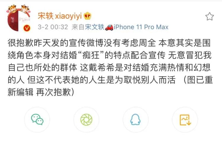 对此,宋轶在微博发文道歉,称:“很抱歉昨天发的宣传微博没有考虑周全,本意其实是围绕角色本身对结婚‘痴狂’的特点配合宣传,无意冒犯我自己也所处的群体,这戴希希是对结婚充满热情和幻想的人,但这不代表她的人生是为取悦别人而活。(图已重新编辑 再次抱歉) ”