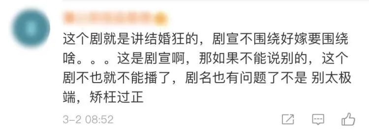 其实,翻阅一下评论区,大多数网友都表示剧宣文案并无不妥。因为宋轶饰演的角色就是一个渴望爱情、对结婚有些痴狂的人,这与女性地位、是否尊重女性并无关系。