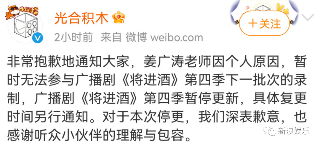 2022年8月5日,公司声明称“姜广涛无法参与《将进酒》录制,广播剧暂停更新。”