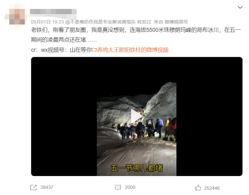 5月1日,有网友在个人视频号爆料:珠峰攀登路线,海拔5500米的昆布冰川凌晨两点堵人 ,五一节哪儿都堵!