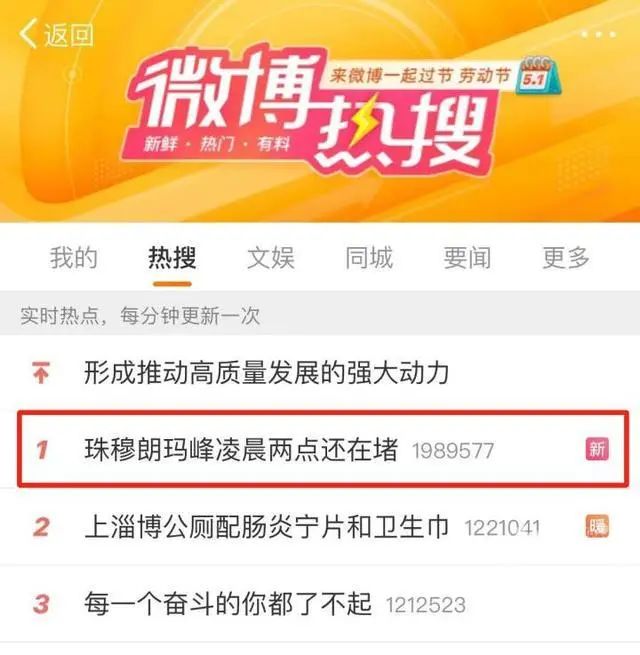 全国各地景区堵堵堵已经不是什么新闻,然而5月1日,“珠穆朗玛峰凌晨两点还在堵”这个话题依然强势占据了热搜榜第一。