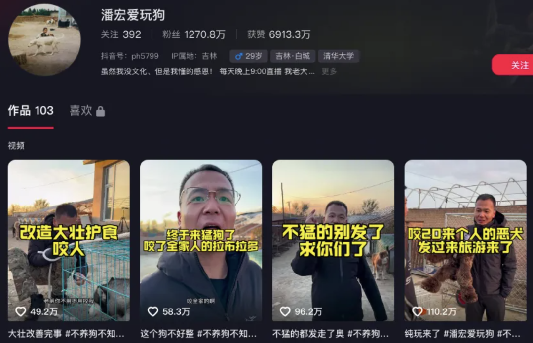 此前,“潘宏爱玩狗”以抽象训狗、直播连线互动等方式火出圈,目前某平台粉丝量已达1270.8万。