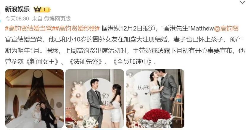 据@新浪娱乐消息,港媒12月2日报道,知名男艺人、“香港先生”高钧贤官宣结婚当爸 ,他已和小10岁的圈外女友在加拿大注册结婚,妻子也已怀上孩子,预产期为明年1月。