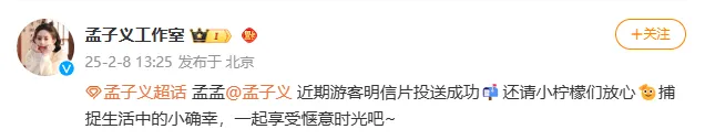 随后,孟子义工作室转发微博称:孟孟近期游客明信片投送成功,还请小柠檬们放心。