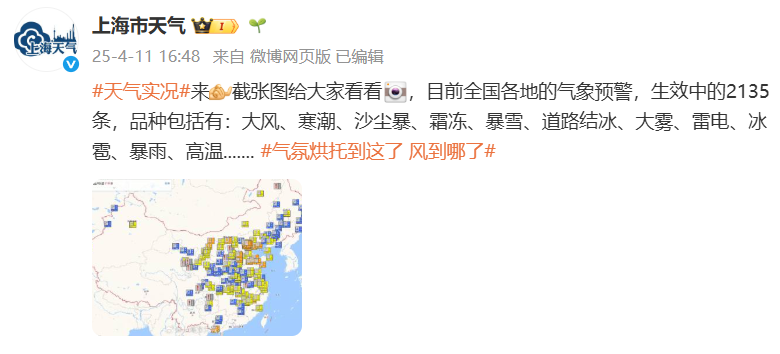 4月11日下午,冷空气的前锋已经到达华北中部,预计4月12日上午起影响本市。这是一股“全能型”冷空气,北方多地有暴雪沙尘大风天气,南方暴雨强对流齐袭。上海4月11日夜晚起天气会出现明显变化。