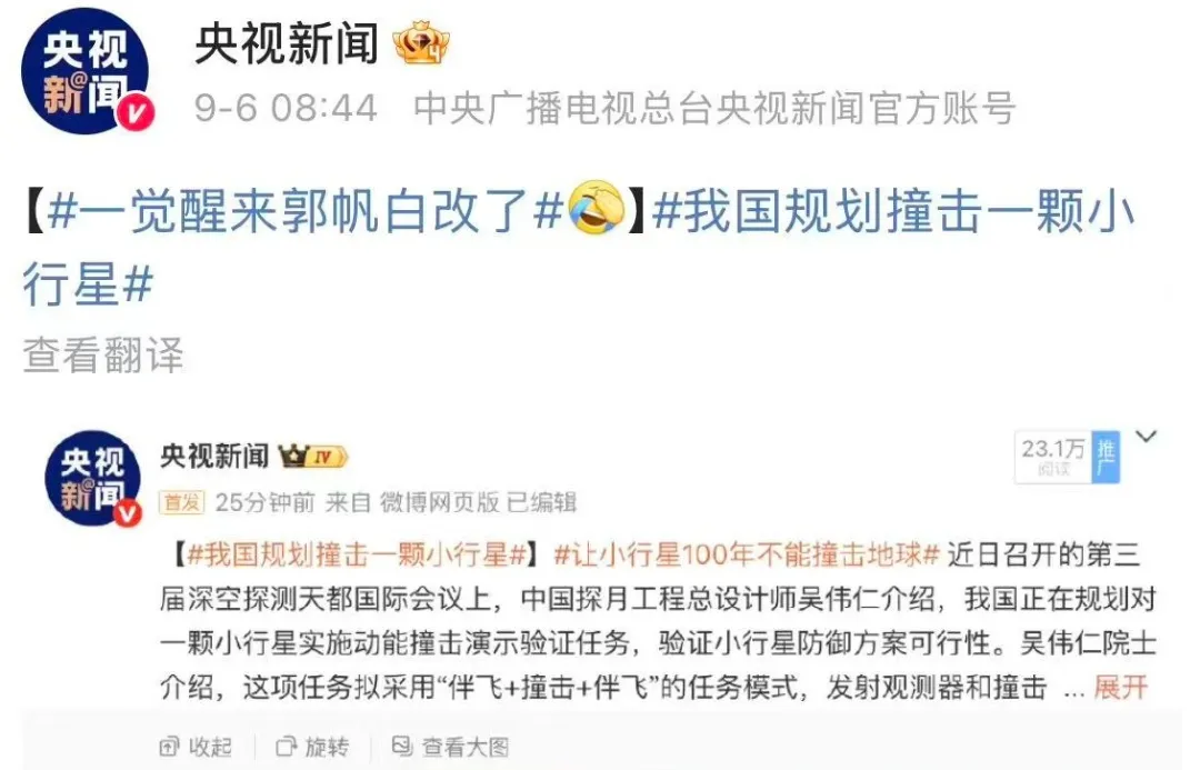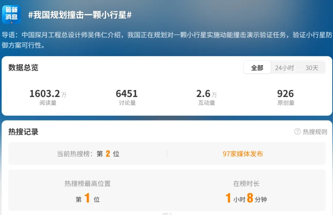 热搜第一!我国规划撞击一颗小行星!知名导演被网友集体喊话……