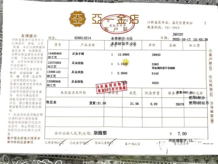 深夜,白天在亚一金店江桥嘉莲华店,和母亲一起将自己款式老旧的金饰品换新款的钱女士,越按计算器,越想越觉得不对劲。