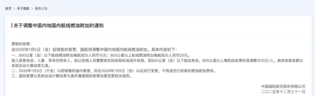 2025年12月31日,东方航空、南方航空和中国国际航空发布通知,自2026年1月5日(含)起销售的客票,调整国内航线旅客运输燃油附加费征收标准。