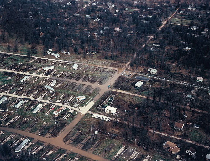 上图是密苏里州时代海滩社区,拍摄于1985年。1982年11月和12月初,美国环保署在时代海滩上对道路和通行权进行了采样分析,发现二恶英的含量从低于10亿分之一到127分之一。