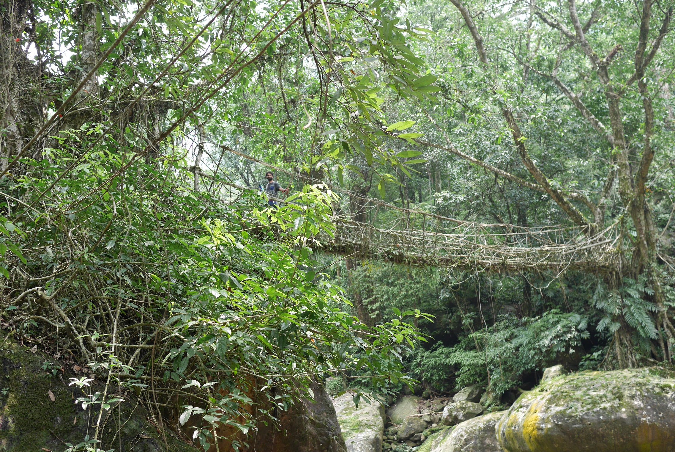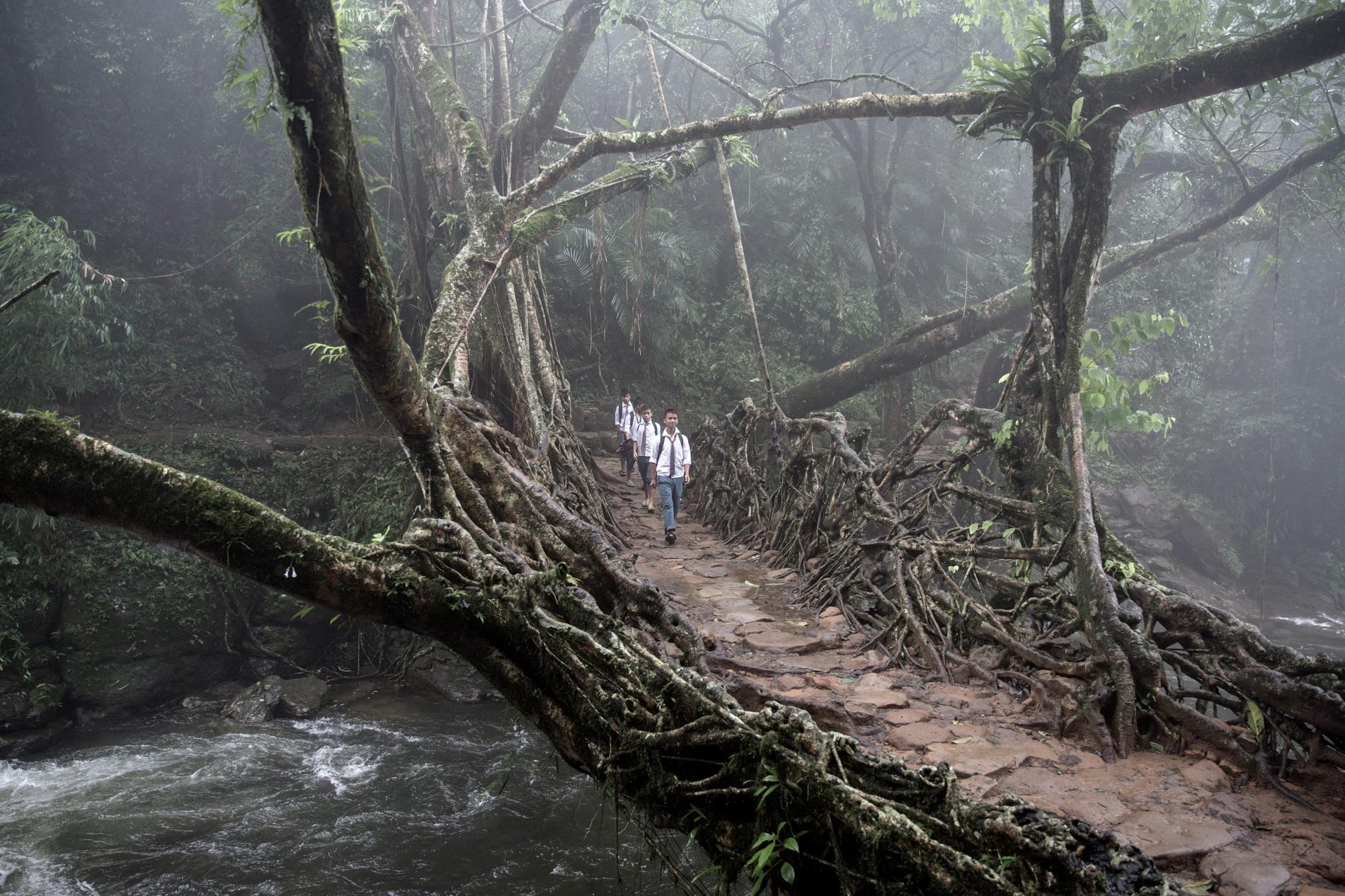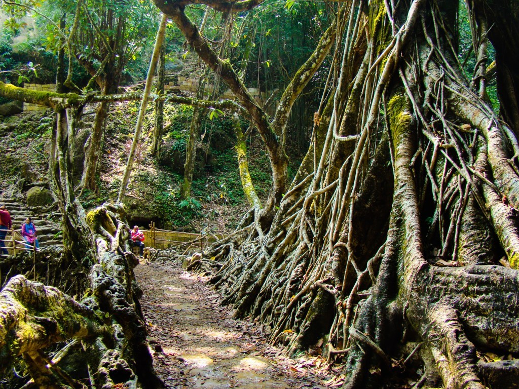 树根在石质的河床上不断生长,不断深入地下,几百条次生根钻到途中,使得桥梁越来越牢固。当地人在树根上铺上石块,把它变成容易行走的路。根须便沿着路边生长。