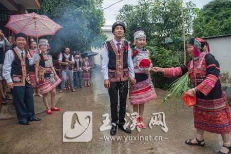 2016年4月24日,蒙蒙细雨中,红河街道红土坡村,新郎白成威把新娘许碧香迎到新房前。进新房之前,一对新人要跨过火盆、套红线、踩砍刀,经过香茅草清扫和稻草烟熏,除去新人身上的一切不洁,让新婚夫妇开始新的人生。
