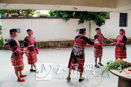 2016年3月20日一早,甘庄街道那骂螺蛳寨的罗永英(右二)为罗颖俊娶亲准备传统婚礼必不可少的红线。按照傣族的传统婚俗,新人进入婚房前要套红线,避免邪恶的东西带入新家。