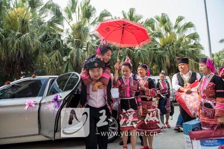 2016年3月20日,甘庄街道甘庄社区的傣族小伙罗颖俊背着新娘李思奥入洞房。新娘是彝族,按照彝族传统,新娘出嫁时由哥哥背着上车。