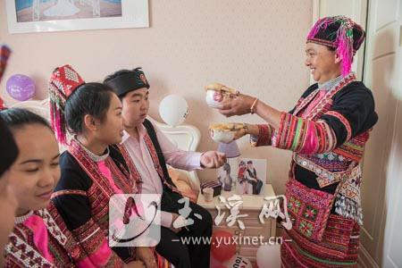 2016年4月24日,元江县红河街道红土坡村,22岁的白成威迎来了大喜的日子。他早早起床,穿上洁白的衬衣和傣涨新郎的传统外套,系上红色的领结,与同伴一起吃过早点,给婚车插上鲜花、贴上喜字,出门迎娶新娘。娶亲的队伍经过几个村寨,穿过甘庄集镇,来到甘庄街道华侨社区,把身着新平傣雅服饰的许碧香迎娶回家。