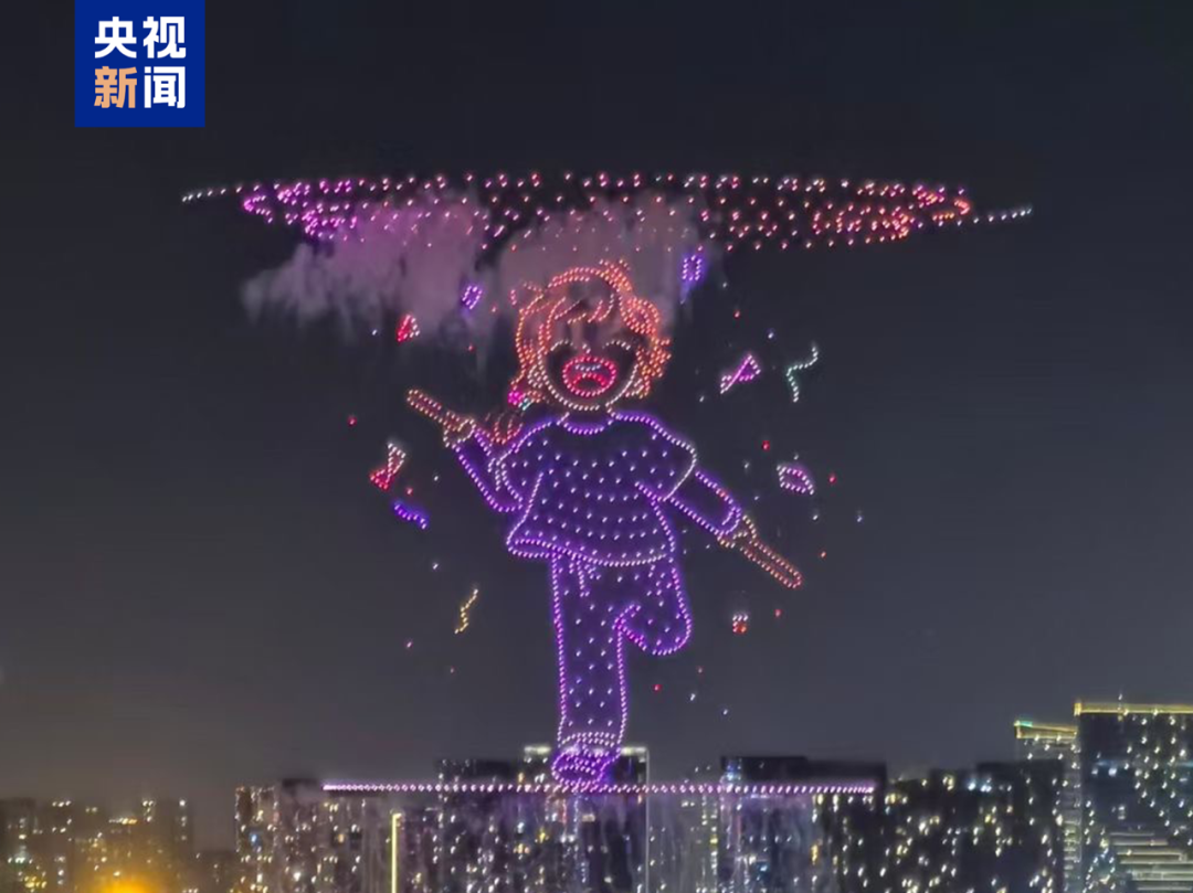 △汕头2025大型烟花晚会,5000只无人机组成的小恩琪卡通形象点燃开幕式。