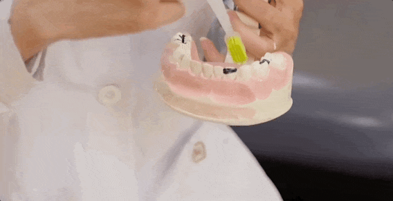 刷牙齿外侧面时,采用画圈的方式操作,另一侧外侧面同理,这种刷牙动作相比水平震颤法更易掌握;