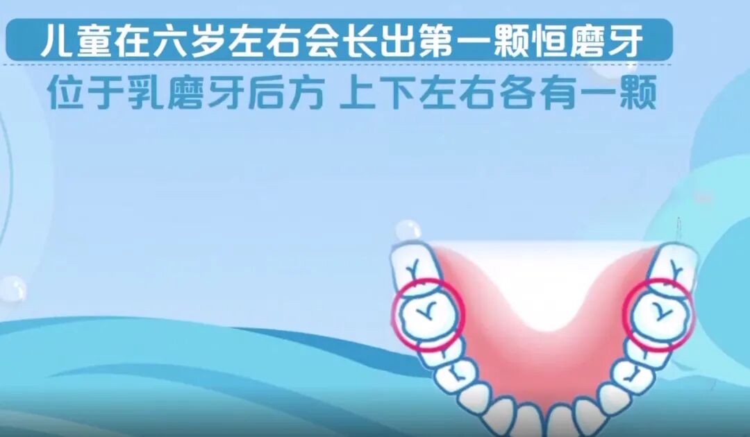 儿童在六岁左右会长出第一颗恒磨牙,位于乳磨牙后方,上下左右各有一颗,称为“六龄齿”。