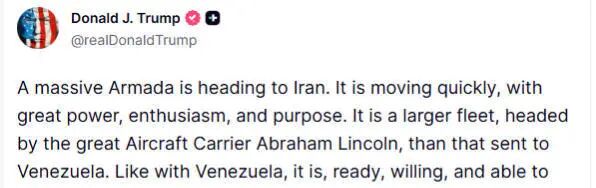 美中央司令部更是在特朗普首次发声威胁的当日放出消息,称美军“亚伯拉罕·林肯”号航空母舰打击群已驶入中东水域,并在次日宣布将举行空军战备演习。