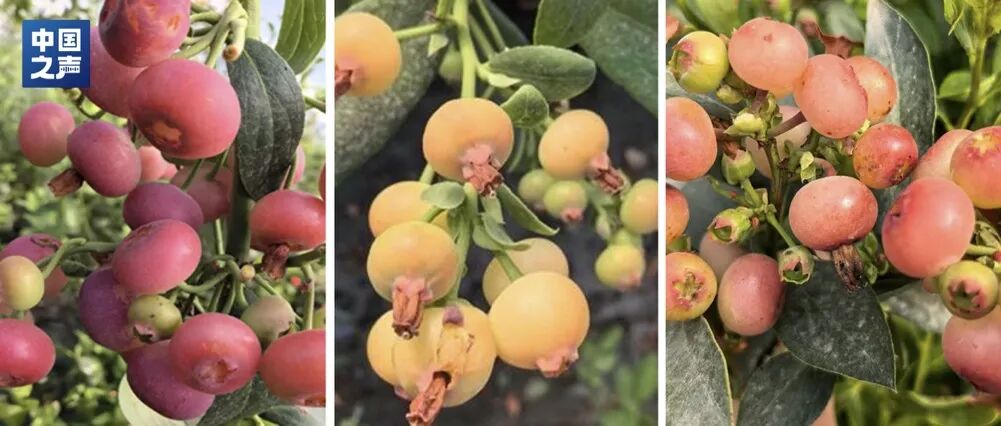 △大连大学蓝莓生物育种团队培育的“红玛瑙”蓝莓(左)、“锦程”蓝莓(中)、“红水晶”蓝莓(右)。
