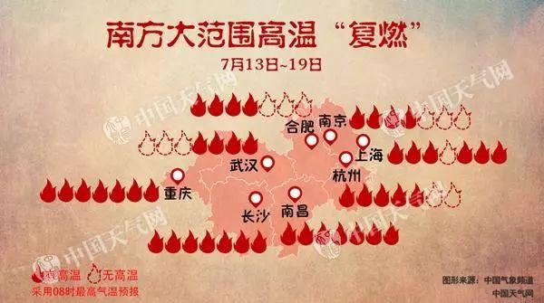 从长江中下游地区到东北南部一带的广大区域,山东、河南、河北、天津、江苏、安徽、上海、浙江、湖南、江西、重庆等超20省区市都将逐渐受到高温影响。