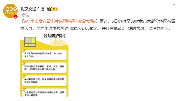 北京市发布雷电黄色预警