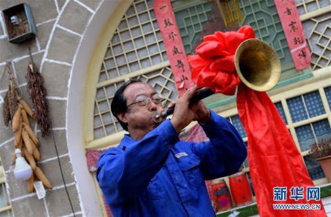 制鼓之余王永军会吹吹唢呐,除了制作安塞腰鼓,王永军也是当地著名的陕北唢呐艺人(10月19日摄)。 新华社记者刘潇摄
