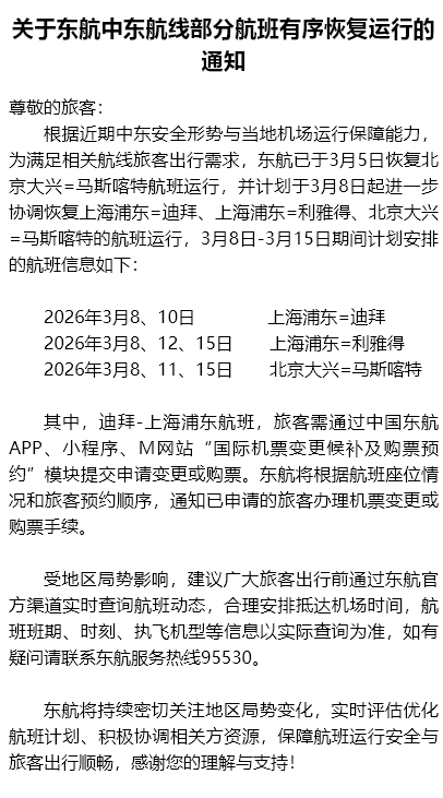 中国东方航空股份有限公司3月6日发布关于东航中东航线部分航班有序恢复运行的通知。