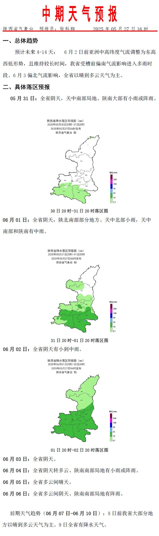预计未来4-14天:6月2日前亚洲中高纬度气流调整为东高西低形势,且维持较长时间,我省受槽前偏南气流影响进入多雨时段。6月3日受偏北气流影响,全省以晴到多云天气为主。
