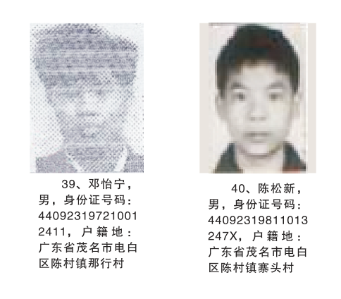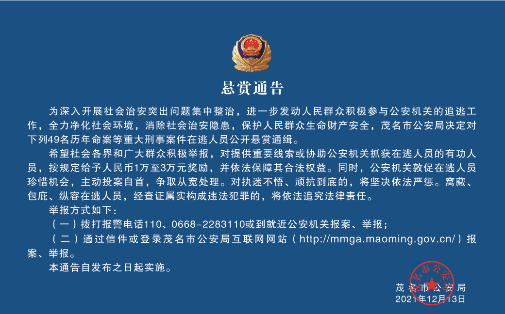 广东茂名警方对49名在逃人员公开悬赏通缉