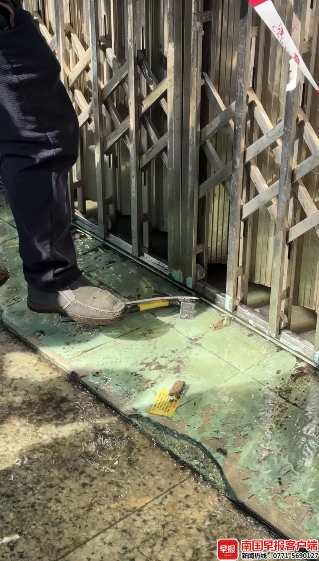 ▲为加快排水速度,部分商户尝试用工具撬起不锈钢门底部的横杆。