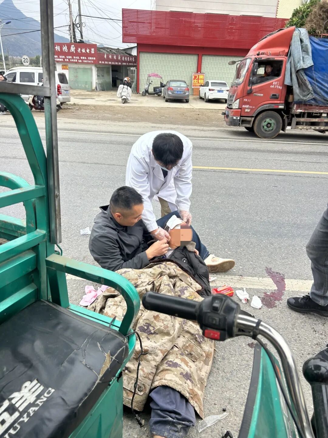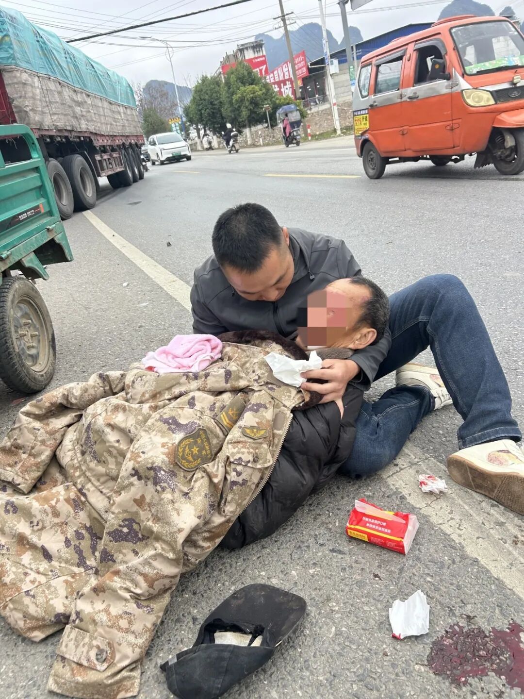 桂林一老人被三轮车压住头部血流不止,休假军人冲上前进行急救
