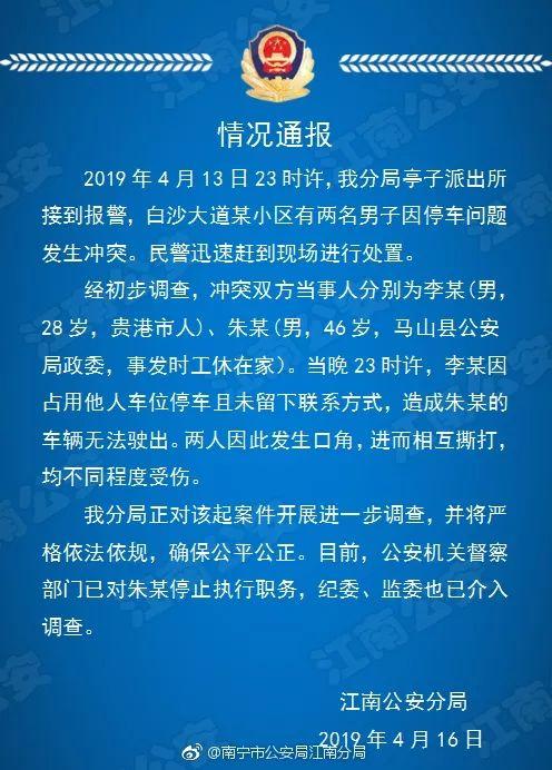 通报称,经初步调查,冲突双方当事人分别为李某(男,28岁贵港市人)、朱某(男,46岁,马山县公安局政委,事发时公休在家)。