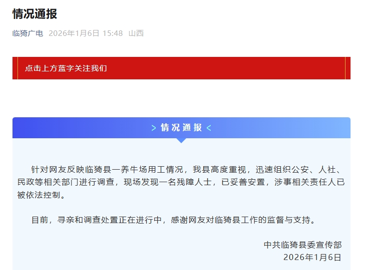 针对网友反映临猗县一养牛场用工情况,我县高度重视,迅速组织公安、人社、民政等相关部门进行调查,现场发现一名残障人士,已妥善安置,涉事相关责任人已被依法控制。