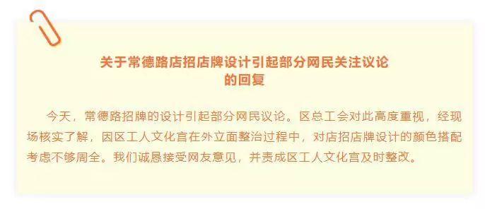 25日凌晨,@上海静安 发文回应称:常德路招牌的设计引起部分网民议论。区总工会对此高度重视,经现场核实了解,因区工人文化宫在外立面整治过程中,对店招店牌设计的颜色搭配考虑不够周全。我们诚恳接受网友意见,并责成区工人文化宫及时整改。